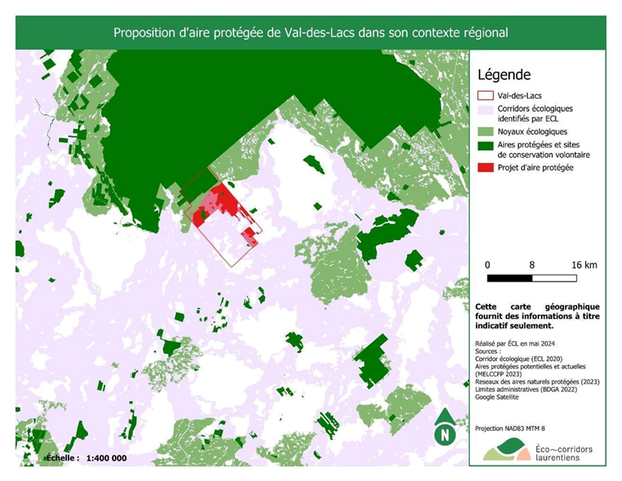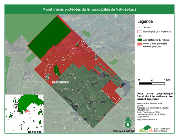 En réponse au cadre mondial Kunming-Montréal et à l'objectif de protéger 30 % des terres et des mers d'ici 2030, Val-des-Lacs a déposé, en octobre 2024, un projet d'aire protégée visant l'ensemble de son territoire public, avec l'appui de nombreux partenaires locaux et régionaux.