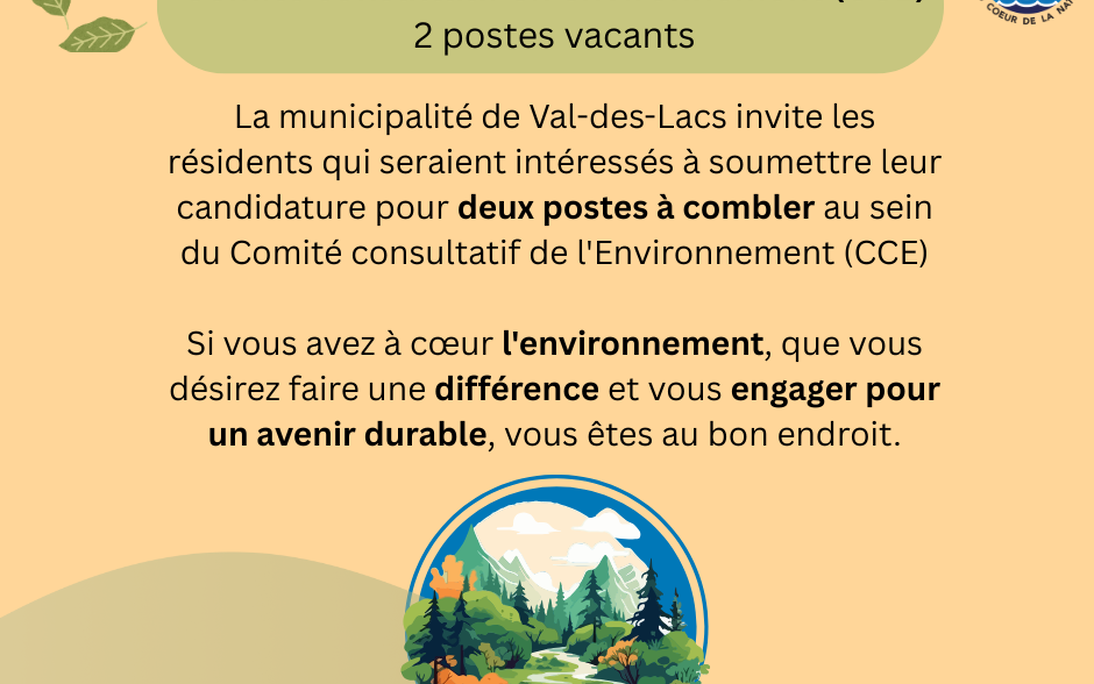 Pour soumettre votre candidature, veuillez faire parvenir votre curriculum vitae et votre lettre de motivation par courriel au plus tard, le 5 décembre 2025 à : inspecteur@val-des-lacs.ca.