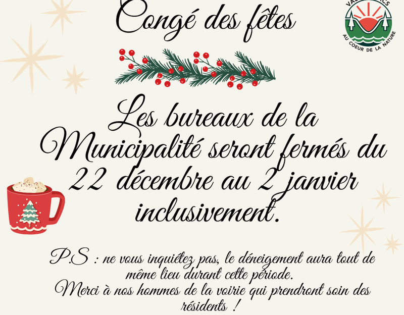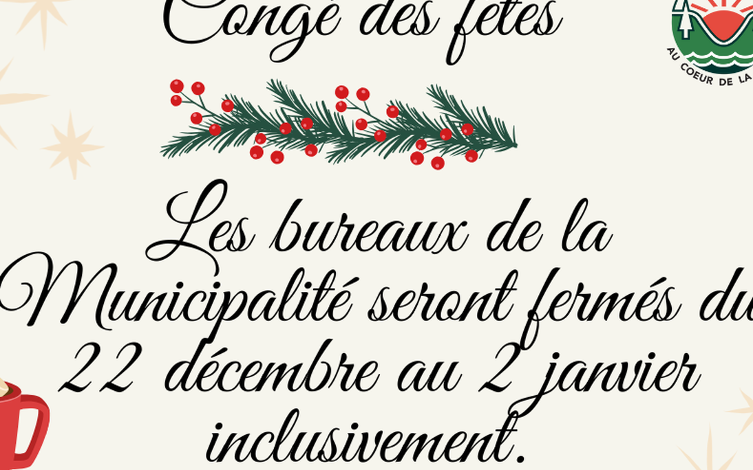 Bonjour chers citoyens, prenez note que les bureaux de la Municipalité seront fermés du 22 décembre au 2 janvier inclusivement.