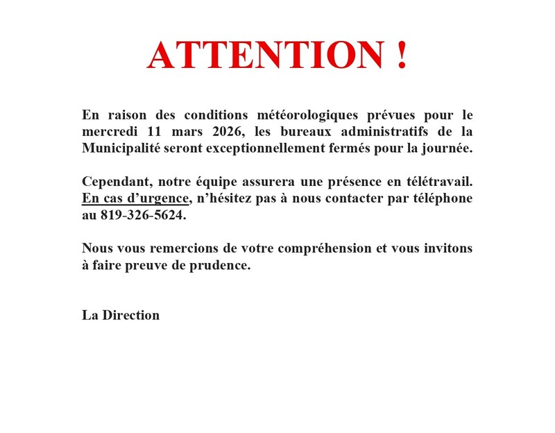 En raison de la tempête annoncée mercredi 11 mars, les bureaux de la Municipalité seront fermés pour la journée.