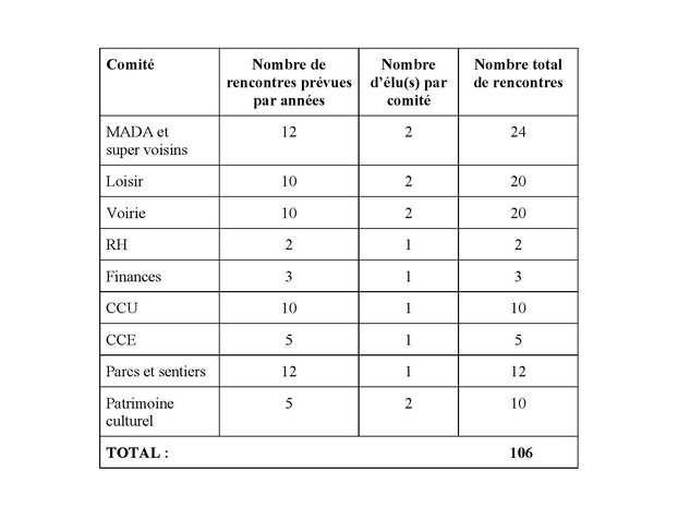 En plus du montant de base mentionné à l'article 3, un montant annuel de 7 720 $ sera alloué comme présence aux différents comités. Ce montant de 7 720 $ est divisé par le nombre total de réunion estimé (106). La somme allouée pour chaque rencontre sera de 72.83 $. Le nombre de rencontres estimé et accordé pour chaque comité est établi dans le tableau ci-bas. Ces sommes seront harmonisées sur 12 mois pour chaque élu.